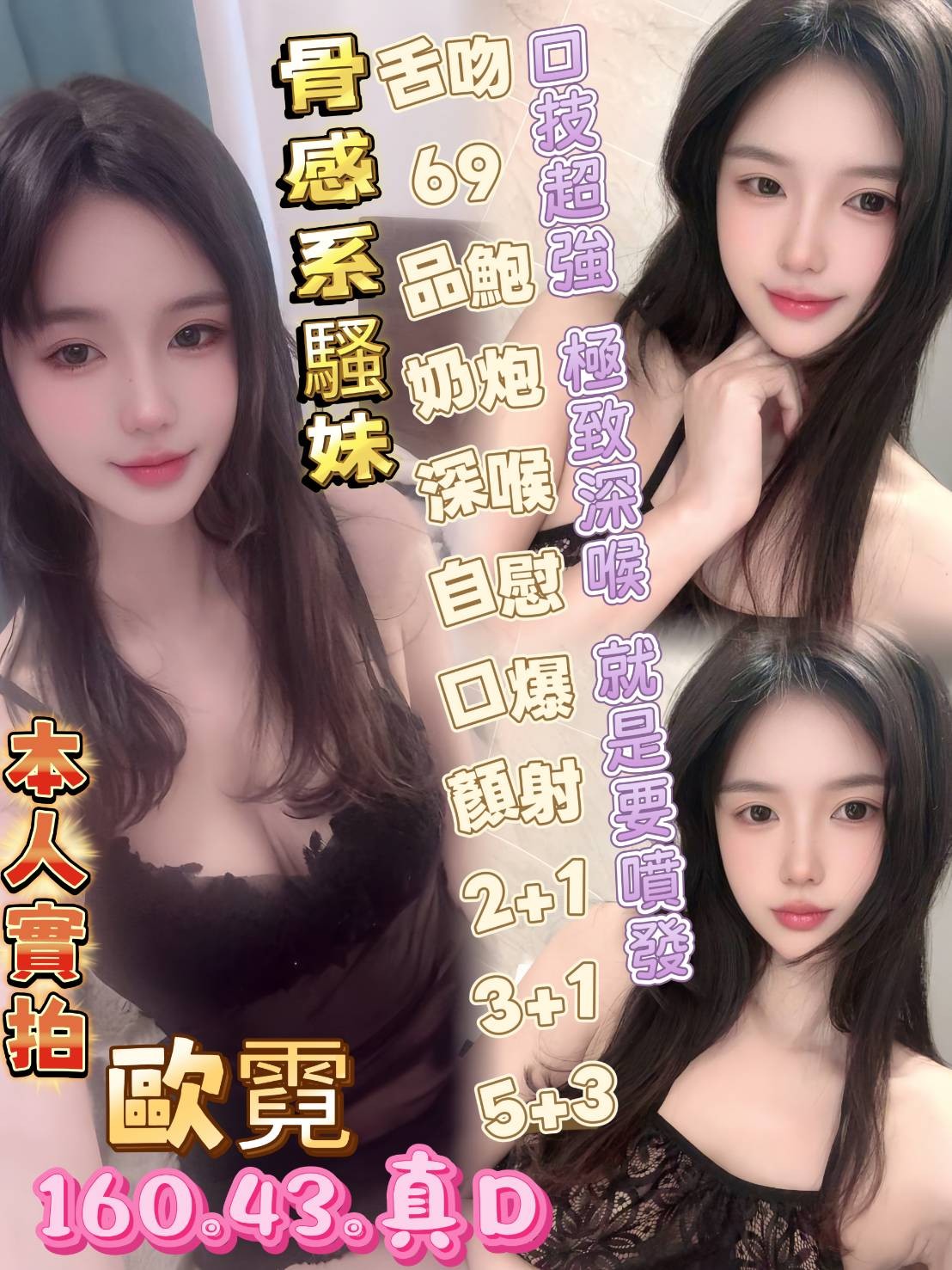 色情共浴/無套吹/小親親/舌吻(視口腔衛生)/奶泡/胸推/臀推/屁推/69/品鮑/按摩/全套愛愛/毒龍(需事先告知)
