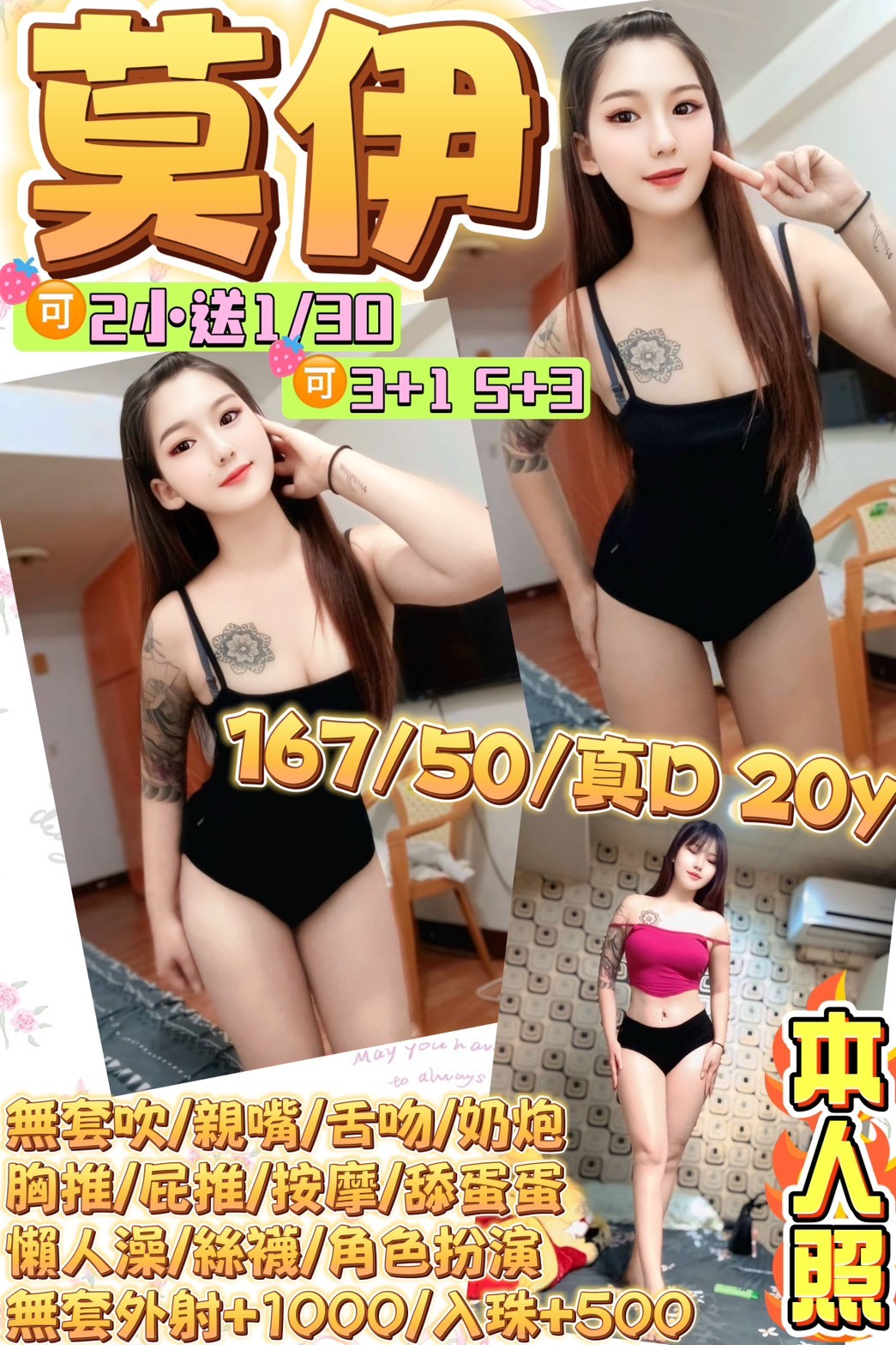無套吹/親嘴舌吻(嘴巴乾淨清潔)/69/品鮑/奶炮胸推(需先告知)/按摩/懶人澡/舔蛋蛋(需先告知)/屁推(需先告知)/水中蕭(需先告知)/淫蕩自慰秀(需先告知)/絲襪角色扮演情趣用品(需自備)/無套中出+1000/入珠+500/可2+1(3/150分)/可3+1/可5+3