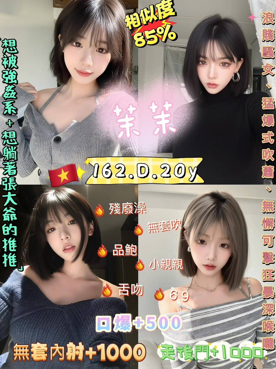 舌吻/無套吹/69/品鮑/按摩/殘廢澡/無套(內射)+1000/口爆+500/後門+1000/2+1(50分計算,150分鐘,3S)
