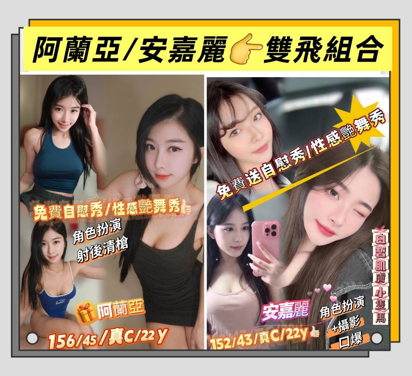 甜蜜共浴/殘廢澡/無套吹/戴套做/小親/舌吻(視衛生)/品鮑/69/冰火/按摩/奶炮/乳交/足交/舔蛋舔睪丸/胸推/水中蕭/射後清槍.……